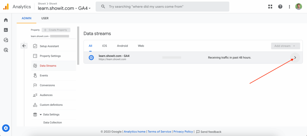 In your dashboard, go to Admin → Data Streams → Web, then enter your site URL and name it something easy to recognize (like “My Showit Site”).